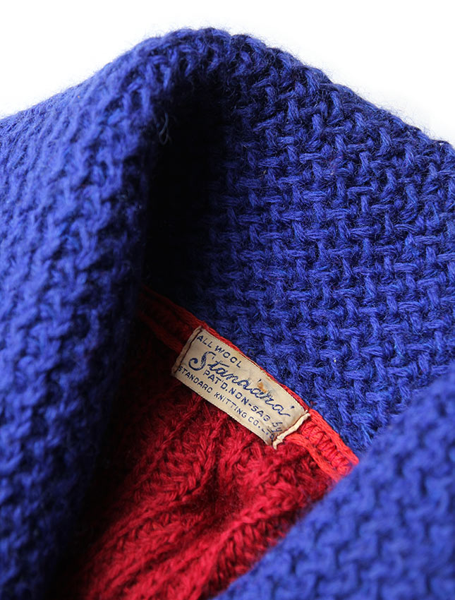 バーガンディーとブルーの色目の珍しい切り替えしでタグはSTANDARD KNITTING COと言うメーカーの物になります。