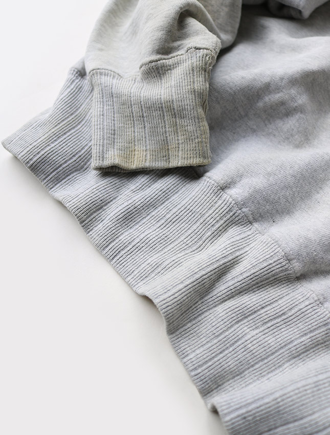 ガゼットははめ込み式になりすべてのリブは針抜きリブ仕様になる豪華なディティールになるスエットになります。 スリーブはセットインになります。