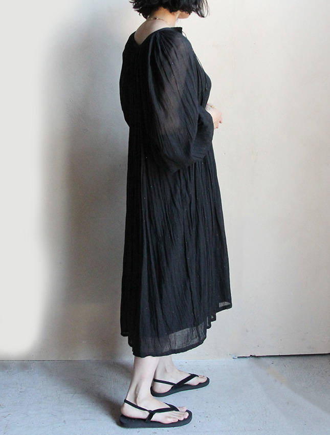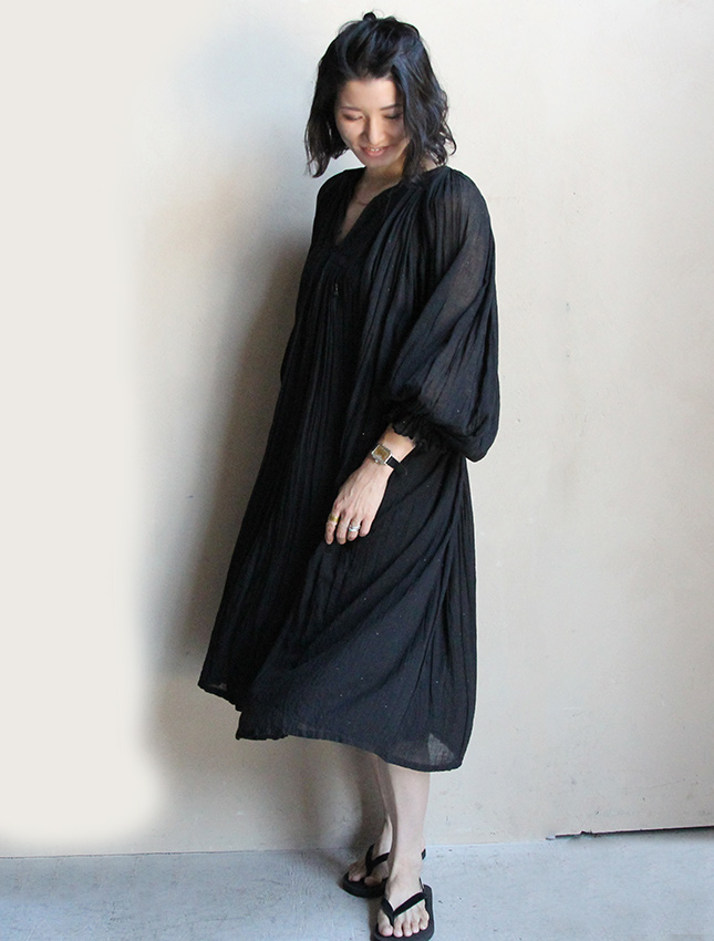 柄物が主流のインド綿ドレスですが、ブラックカラーがとてもシックで女性らしく艶やかな印象です。